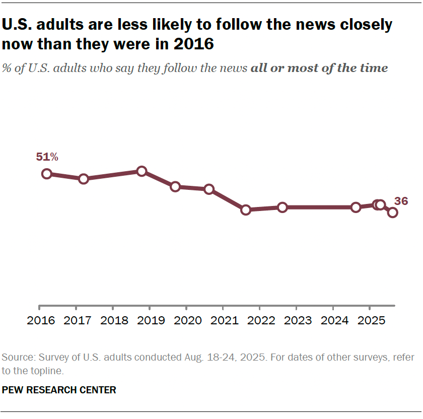 Graph via Pew Research Center from Americans are Following the News Less Closely Than They Used To