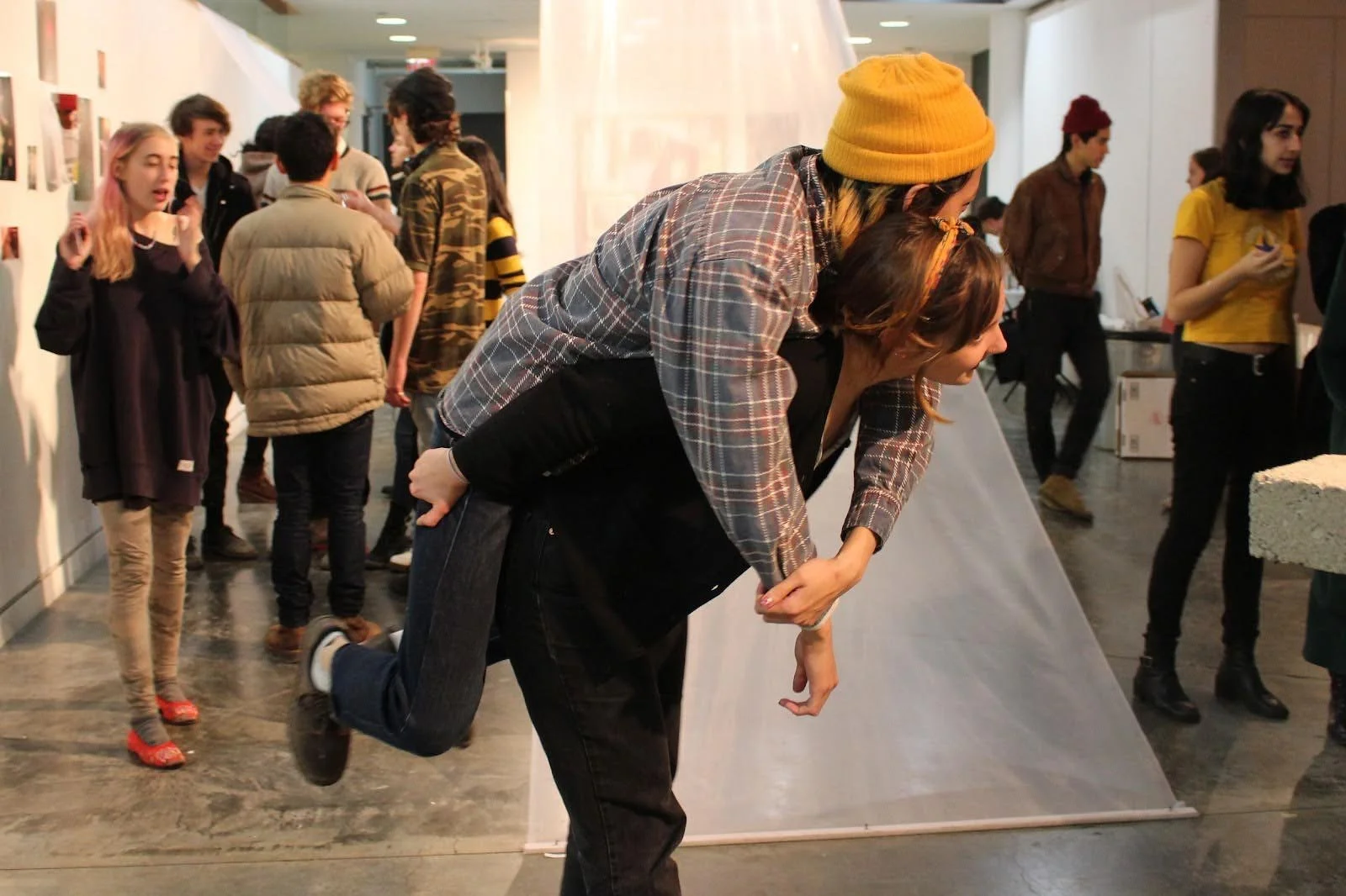 Tuyên Nguyễn '17 hitches a ride with Emma Sadowski '15 at an exhibition of student work in Heimbold Visual Arts Center.